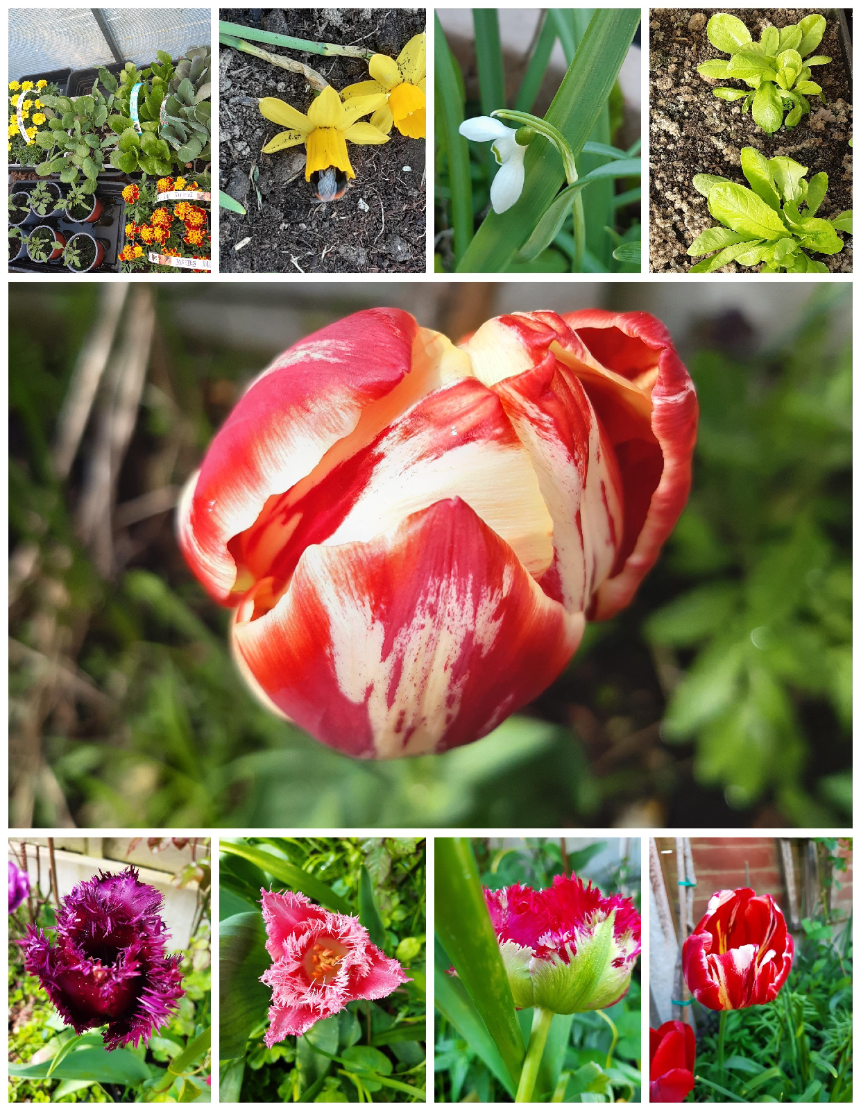 I also got some Tete-a-tete miniature Daffodils (5 bulbs in a pot) and I was splitting them up, to plant them in my flower beds as small clumps, when that little orange bum bumblebee landed on one clump having a drink of the sweet nectar. Last year, in the autumn, I potted up approx 100 snowdrops which came on fabulously this spring giving me a real showcase of early blooms. Now it's time to plant them in green for another showcase next year. Also got some Tulips from Amsterdam (Schipol Airport) and my goodness, what a display they put on with their frills and stripes and mixture of colour. I'm looking forward to next year's display now 😜